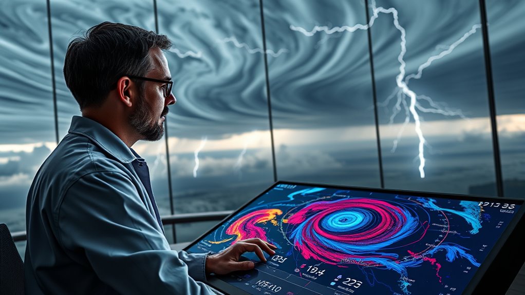 Furthermore, the integration of AI into weather modeling supports climate adaptation strategies by providing detailed, localized forecasts that help you prepare for extreme weather events. When you understand the likelihood of heavy rainfall, strong winds, or drought conditions, you can implement measures to protect assets and guarantee safety. This proactive approach reduces vulnerabilities and increases resilience to climate-related challenges. AI’s ability to process real-time data means you’re not just reacting to weather changes but anticipating them days or even weeks in advance. That foresight enables you to allocate resources efficiently, plan contingency measures, and communicate effectively with your team or community.