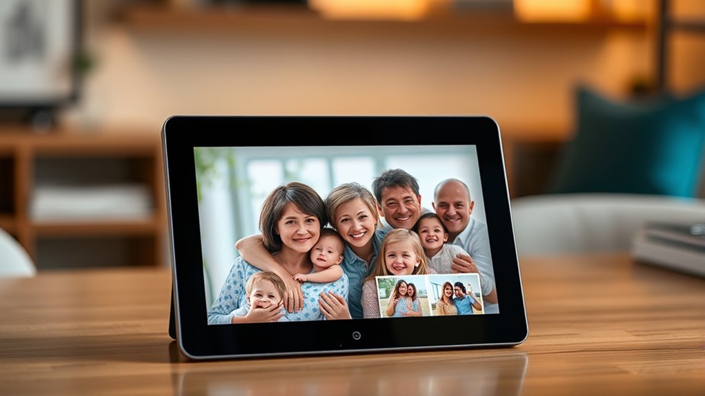 Have you considered how your digital photo frame connects to your devices? Most frames that support email sharing rely on Wi-Fi, which allows for seamless photo transfers without cables. Some require setting up a unique email address or account, making it easy to send photos directly to the frame. Compatibility with cloud services or dedicated apps can also influence connectivity options, offering additional ways to sync images. Security features like password protection or encrypted connections are common, ensuring your photos stay private during transfer. Keep in mind, a strong and stable Wi-Fi connection is key—weak signals can slow down or disrupt photo uploads. Choosing a frame with reliable connectivity options guarantees smooth, hassle-free sharing of your favorite memories.