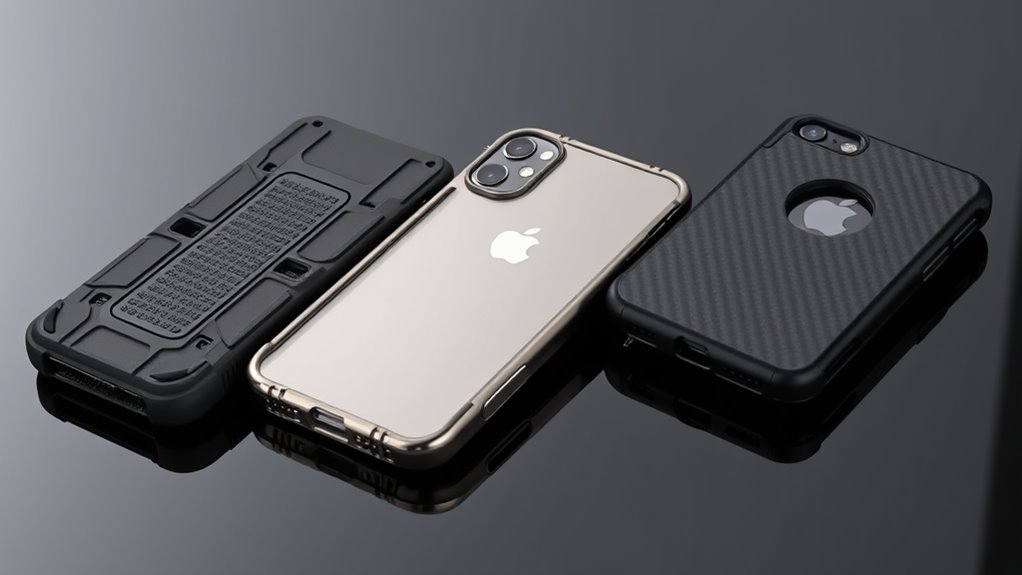 When evaluating iPhone 17 Pro Max cases, drop and shock resistance should be at the top of your list. Look for cases with military-grade protection, certified to withstand drops from 10+ feet. Reinforced bumpers and raised bezels are essential to safeguard the screen and camera from impact and scratches. Multi-layer construction helps absorb shocks during accidental falls, reducing the risk of damage. Impact-absorbing materials like TPE, TPU, or silicone are key for cushioning your device effectively. Some cases even feature airbags or reinforced corners designed specifically to disperse shock during drops. Prioritizing these features ensures your phone stays protected against everyday accidents, giving you peace of mind without sacrificing style.