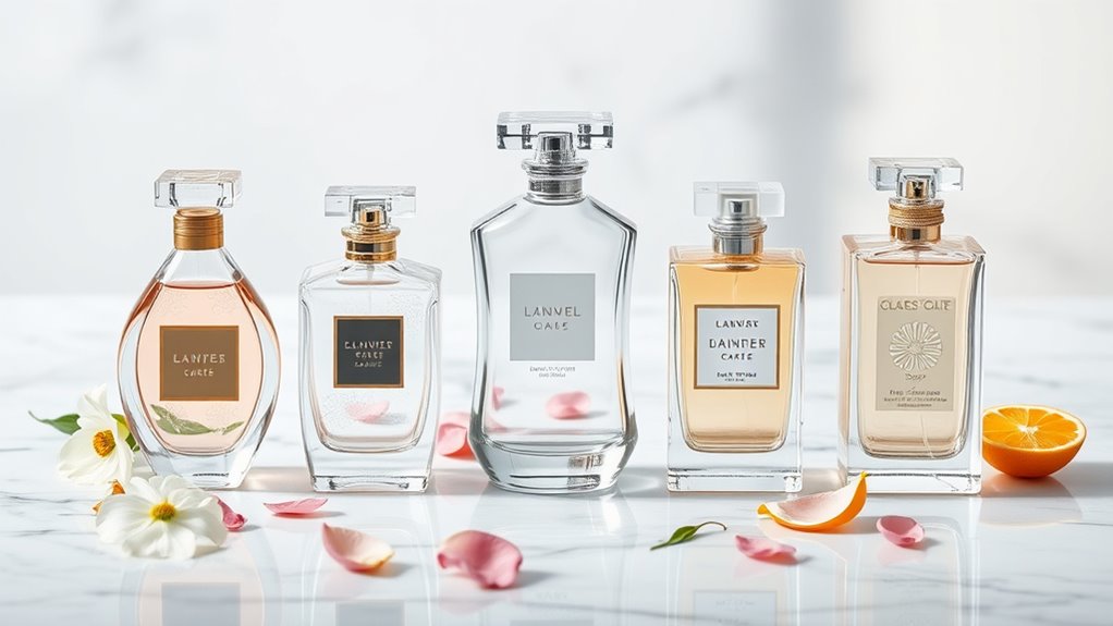 Choosing a perfume that truly reflects your personality involves more than just picking a scent you like—it’s about how it interacts with your body chemistry and fits your lifestyle. Scent personalization lets you select fragrances that enhance your natural aroma, creating a unique signature. You can customize layers by blending floral, woody, or fruity notes to craft a scent that aligns with your mood, season, or occasion. The perfume concentration—like eau de parfum or eau de toilette—also influences how personalized and lasting the scent feels. Some brands even offer bespoke options, allowing you to design a signature fragrance from scratch. This level of customization guarantees your perfume isn’t just a fragrance, but an extension of your identity.