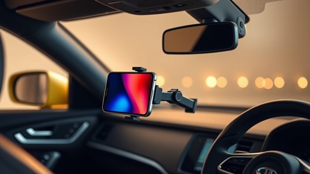 To guarantee your phone mount doesn’t obstruct your view, I position it just below or beside my line of sight, so I can glance at it without turning my head. I choose mounts that are adjustable and keep them low enough that they don’t block important gauges or mirrors. Regularly checking and adjusting the mount helps me stay safe and maintain full visibility while driving.