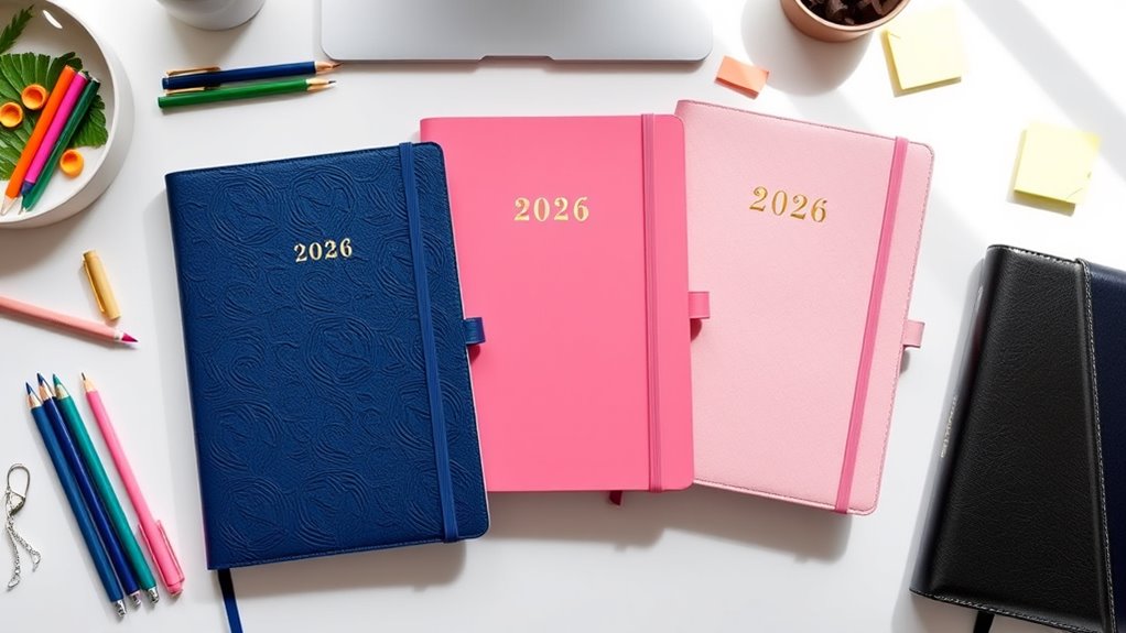 If you want to stay organized in 2026, I recommend the POPRUN 2026 Planner, a compact yet detailed option with hourly layouts and motivational extras, perfect for busy days. The Calendar & Tabs Planner offers a sturdy hardcover with easy navigation and inspiring quotes, great for home or office. For portability, the A5 Weekly & Monthly Planner fits easily in your bag and provides a complete view of your year. Keep exploring for more tips to choose the best planner for you.