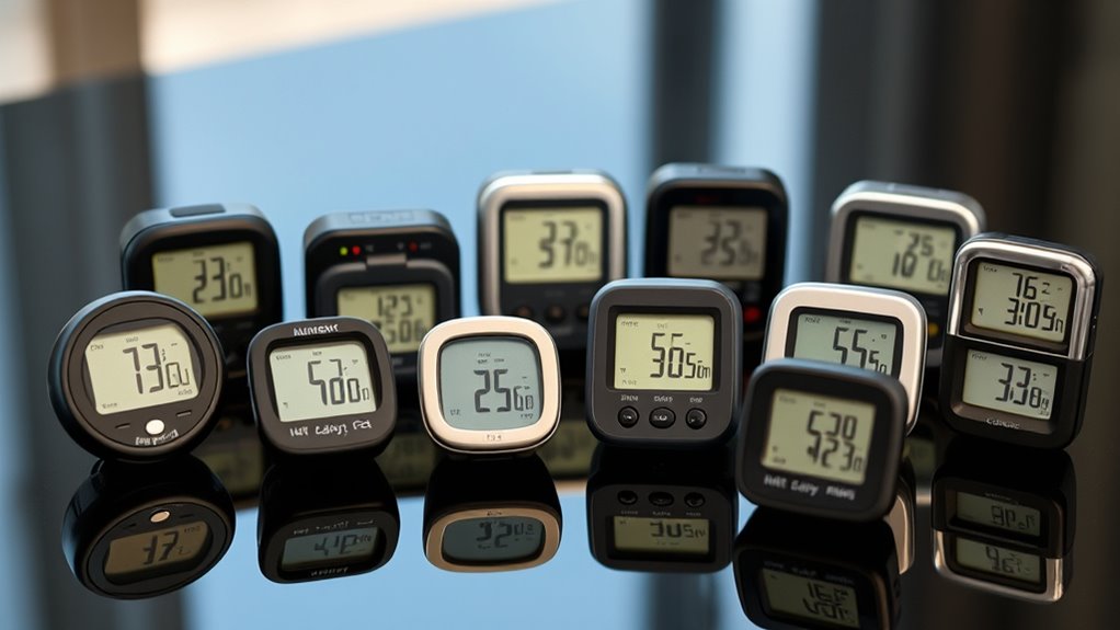 Durability features are vital when selecting a portable hygrometer, especially since these devices often face challenging environments. I look for models with water-resistant or waterproof exteriors to handle moisture exposure and harsh conditions. Impact-resistant materials like rugged plastics or rubberized casings protect against drops, shocks, and vibrations, ensuring the device survives transport. Sealed seals and sturdy construction keep internal sensors safe from dust, dirt, and environmental contaminants, maintaining accuracy over time. Additionally, longer battery life with low power consumption components reduces the need for frequent replacements, enhancing reliability. Weatherproof certifications, such as IP ratings, are also vital—they indicate the hygrometer’s ability to perform reliably outdoors or in extreme conditions. These durability features give me confidence that my device will withstand everyday wear and tear.