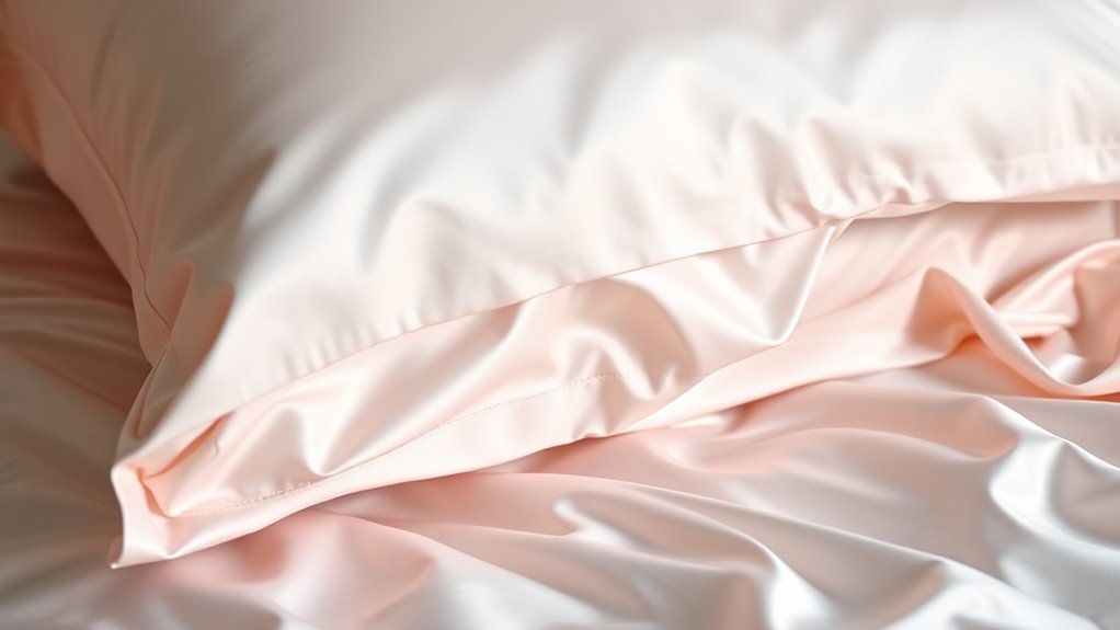 Think of silk pillowcases as gentle whispers for your skin. For sensitive skin, I recommend mulberry silk; it’s like a soft lullaby that caresses without irritation. Charmeuse silk is also excellent, with a smooth, breathable surface that minimizes friction. These types are less likely to cause redness or breakouts, making your sleep a peaceful retreat. Trust me, choosing the right silk feels like wrapping yourself in a caring embrace every night.