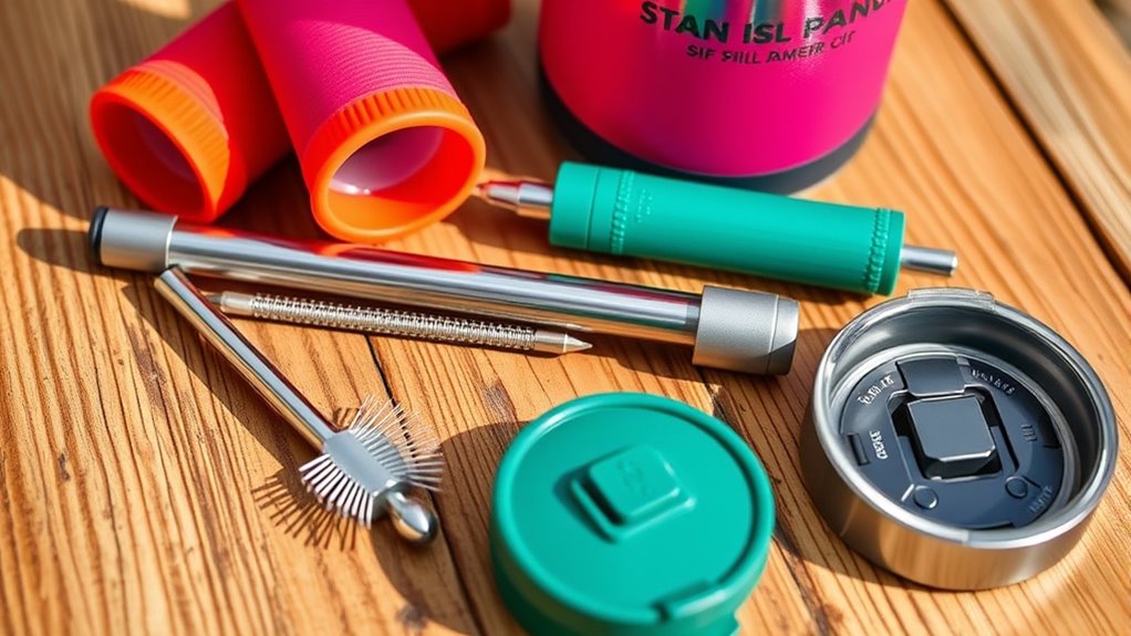 Think of your Stanley tumbler accessories as tiny guardians of freshness. I recommend hand-washing them with warm, soapy water after each use, paying special attention to crevices. Avoid harsh chemicals or abrasive sponges that could damage materials. Regularly check for cracks or buildup, and replace parts as needed. By maintaining them well, you guarantee your hydration stays pristine, and your tumbler remains a trusty companion for longer.