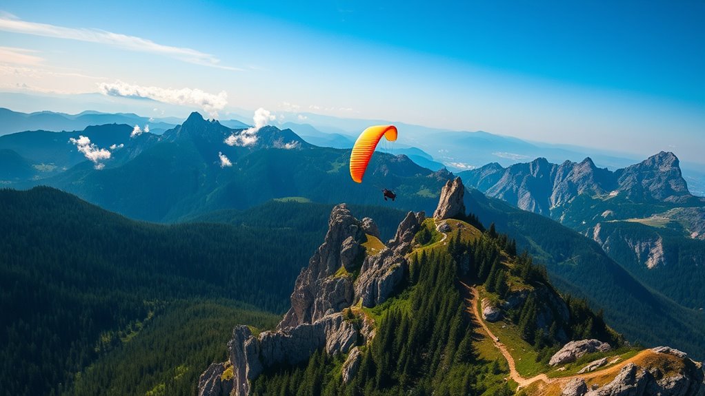 Did you know Romania has over 30 designated paragliding sites? You’ll need permits for some areas, especially protected zones, and must follow regional regulations to guarantee safety and conservation. Always check local rules before you fly, as permits are required for certain locations. By doing so, you’ll enjoy your adventure legally and responsibly, making your experience in the Carpathians safe and unforgettable.
