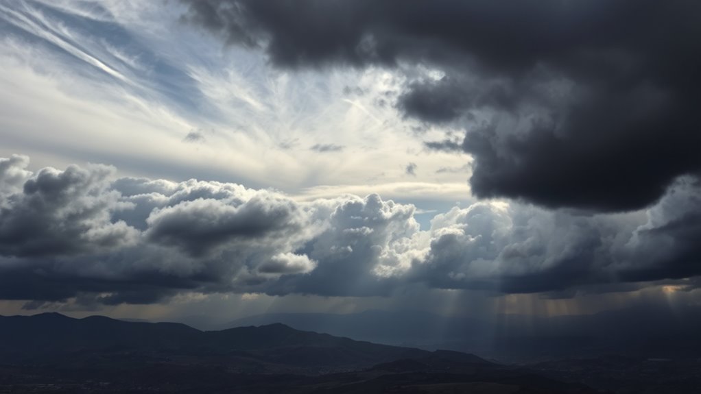 When a cold front approaches, it forces warm, moist air to rise rapidly. You can often see this process unfold through satellite imagery, which reveals the developing cloud formation along the front’s boundary. As the warm air lifts, it cools and condenses, creating thick, towering clouds like cumulonimbus. These clouds signal the initial stages of storm development. Satellite images help meteorologists track how the warm air interacts with the advancing cold air, illustrating the sharp contrast in temperatures and moisture levels. This interaction causes intense cloud formation, setting the stage for powerful lift and potential weather phenomena. Recognizing these patterns allows you to understand how cold fronts actively shape atmospheric dynamics through the rapid ascent of warm, moist air. High refresh rates in satellite imagery can reveal rapid changes in cloud development, providing crucial insights into storm progression.
