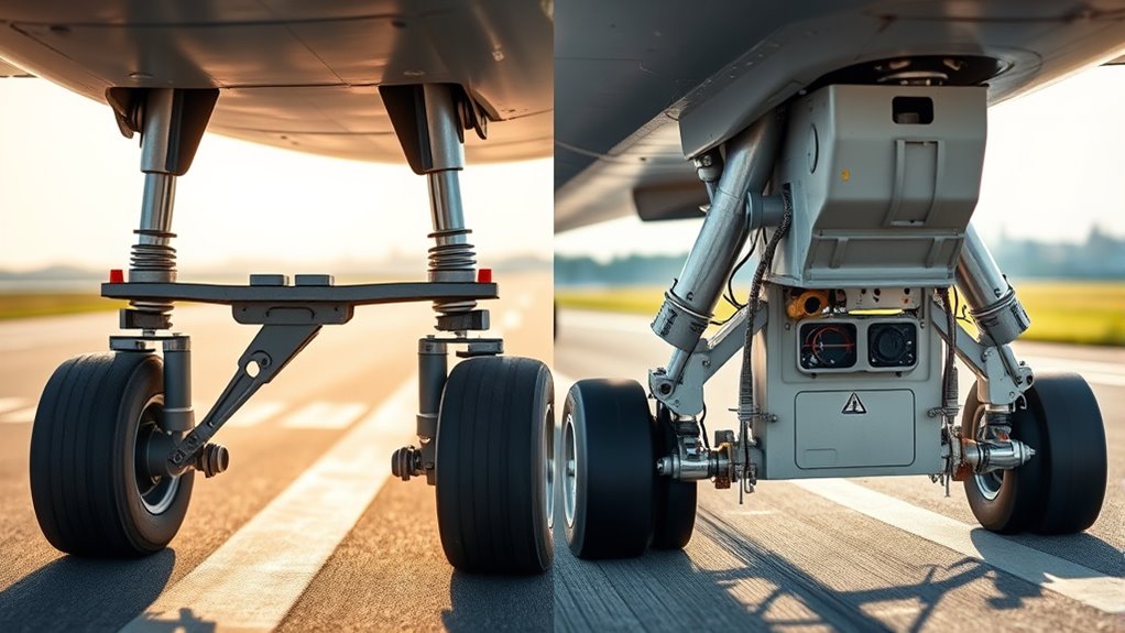 Ever wonder what keeps that heavy aircraft safely on the ground? You’ll find materials like high-strength steel and alloys, but composite materials are increasingly popular for their lightweight strength. Hydraulic systems power the operation, ensuring smooth retraction and extension. These materials help withstand the stresses of takeoff and landing, making your flight safer. Isn’t it amazing how advanced materials and hydraulic tech work together to support every journey?