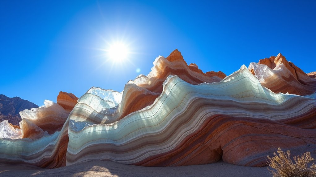 You’ll notice that rocks in Owens Valley contain different mineral types, giving each one unique features. Igneous rocks form from cooled magma, while sedimentary rocks result from compacted sediments; their colors and textures reflect their origins. Understanding these compositions helps explain the striking appearance of the wave-like structures you see. Additionally, the presence of diverse rock types influences the landscape’s visual diversity and geological history.