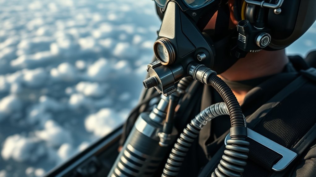 Oxygen masks are your primary interface for breathing supplemental oxygen at altitude. They come in various styles, but most are designed for quick donning and secure fit, allowing you to breathe comfortably under demanding conditions. When you reach the critical altitudes where natural oxygen levels drop, you simply put on your oxygen mask, which delivers a steady flow of oxygen directly to your nose and mouth. This setup helps prevent hypoxia and keeps you alert, so you can focus on maintaining control and enjoying the view.