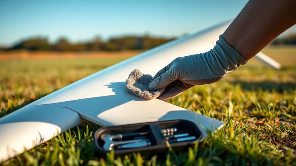 Before you fly, it’s essential to carefully inspect the wing surfaces for any damage or debris. Check the entire wing surface, looking for cracks, dents, or tears that could compromise flight safety. Remove any debris such as leaves, dirt, or insects that may have accumulated during your last flight. Use a soft cloth or brush to gently clean the surface, making certain nothing interferes with airflow. Pay close attention to the leading edge and wing tips, as these areas are most vulnerable to damage and debris buildup. Removing debris and inspecting for damage help maintain the wing’s integrity and performance. Regularly cleaning and checking the wing surface ensures your glider remains in top condition, ready for safe and smooth flights. Incorporating visual inspection techniques can further help identify potential issues early.