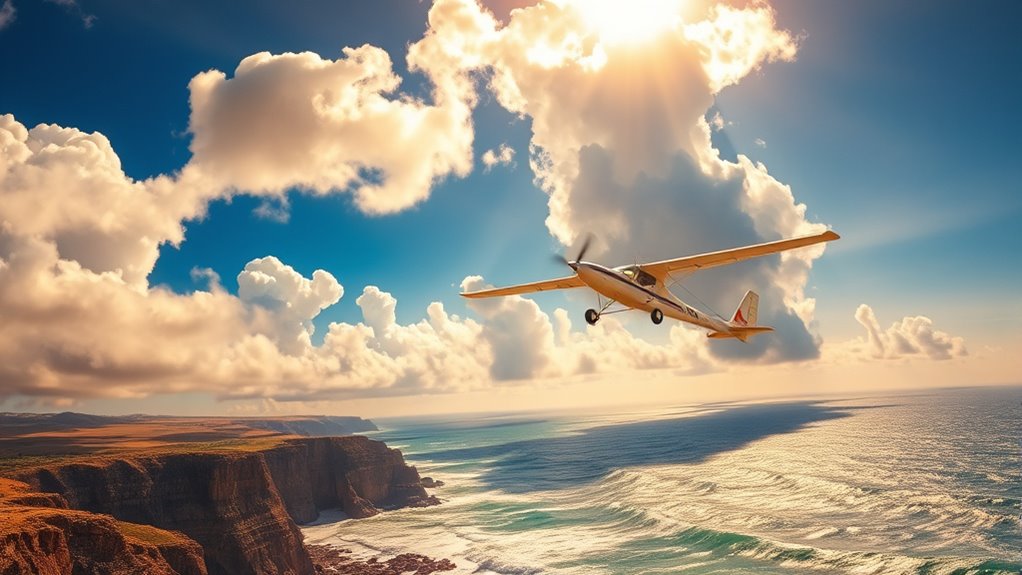 You’ll find that weather patterns heavily influence whether thermal or wave soaring is preferable. Clear skies with rising air favor thermal soaring, making it ideal to climb and stay aloft. Conversely, strong, steady winds over mountain ranges create wave conditions, perfect for long-distance flights. For effective flight planning, monitor wind directions and cloud formations closely, so you can choose the best technique based on current weather patterns and maximize your soaring experience.