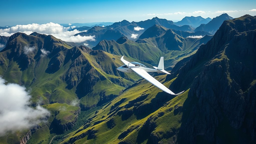 Ridge soaring in Wales along the Black Mountains offers an exhilarating experience as you ride the landscape’s dramatic ridges with steady winds and thermal currents. Ideal conditions include sunny days with wind blowing perpendicular to the cliffs, creating lift zones that help you stay aloft. Your skills in reading subtle weather cues and thermal activity are key to a successful flight. Keep exploring, and you’ll discover how the terrain and weather work together to elevate your soaring adventure.