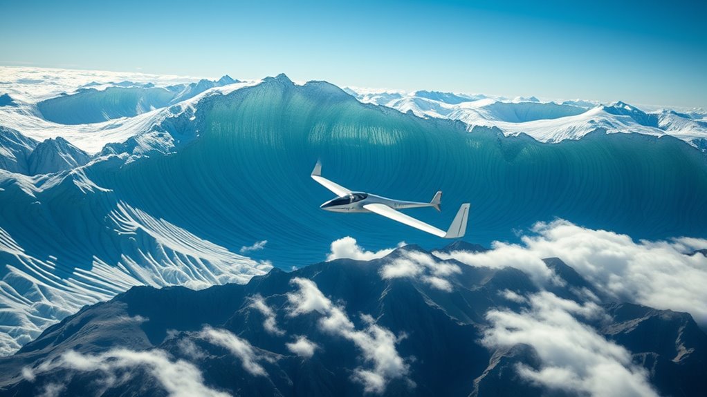Now that you understand how atmospheric waves lift gliders to incredible heights, imagine yourself soaring above mountain ranges, riding these invisible currents. For example, picture a pilot using wave soaring to reach 30,000 feet, effortlessly riding the wave’s energy. With knowledge of wave dynamics, you too could harness these powerful atmospheric features. So, next time you see a glider gracefully climbing, remember, you’re witnessing the sky’s hidden energy at work—ready for you to explore.